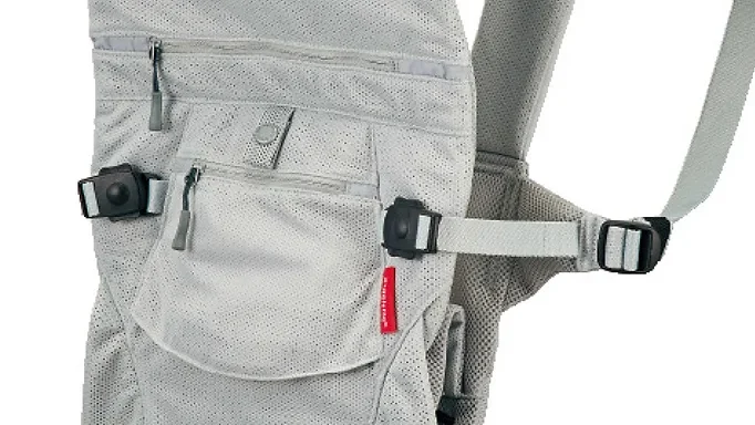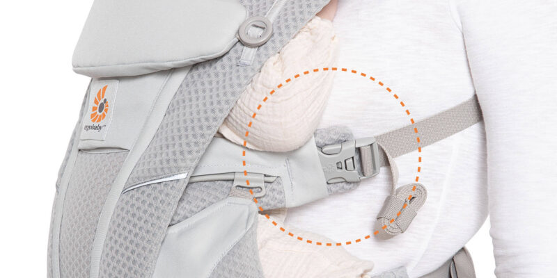エルゴのオムニブリーズは、赤ちゃんの手が届く場所にあるバックルがカンタンに外せないダブルロック式のバックルになっていますよ!