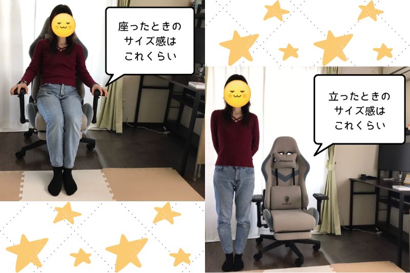 Dowinx ゲーミングチェア LS-66684Dの隣に立ったときと、座ったときのサイズ感は上記の写真の通りです。