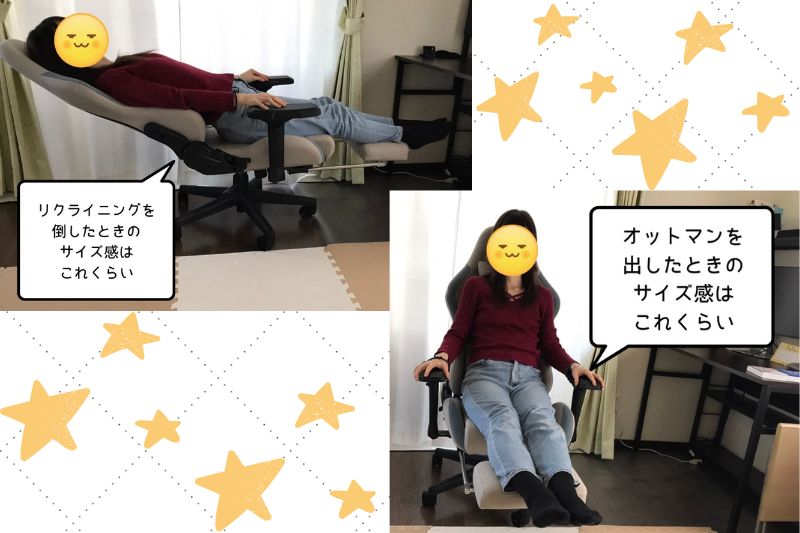 シートを倒したときと、背もたれをすこし倒してオットマンを限界まで引き出したときのサイズ感は上記の通りです。