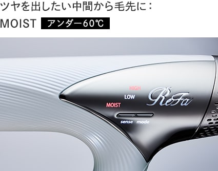 - MOISTモード:アンダー60度の温風。髪の中間~毛先をしっとり仕上げられます。