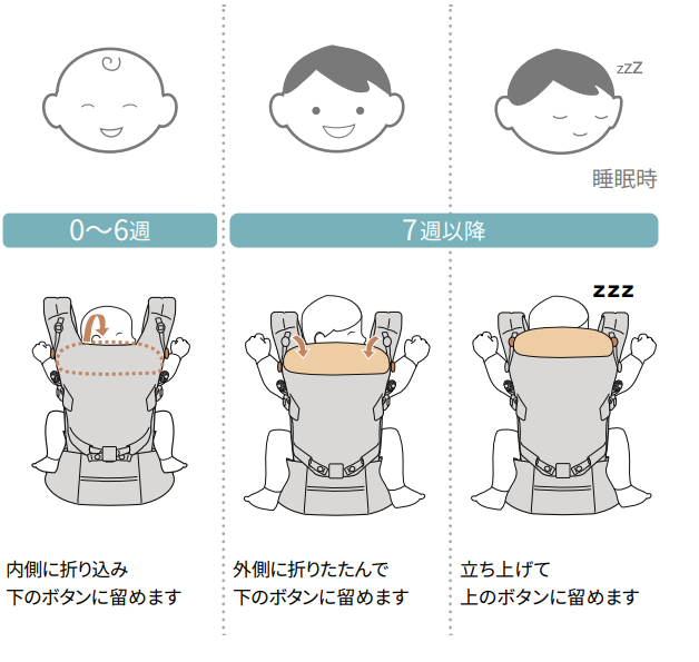 エルゴアダプトソフトフレックスは、ヘッド&ネックサポートがあるので、成長に合わせて首元も3段階で調節できます。